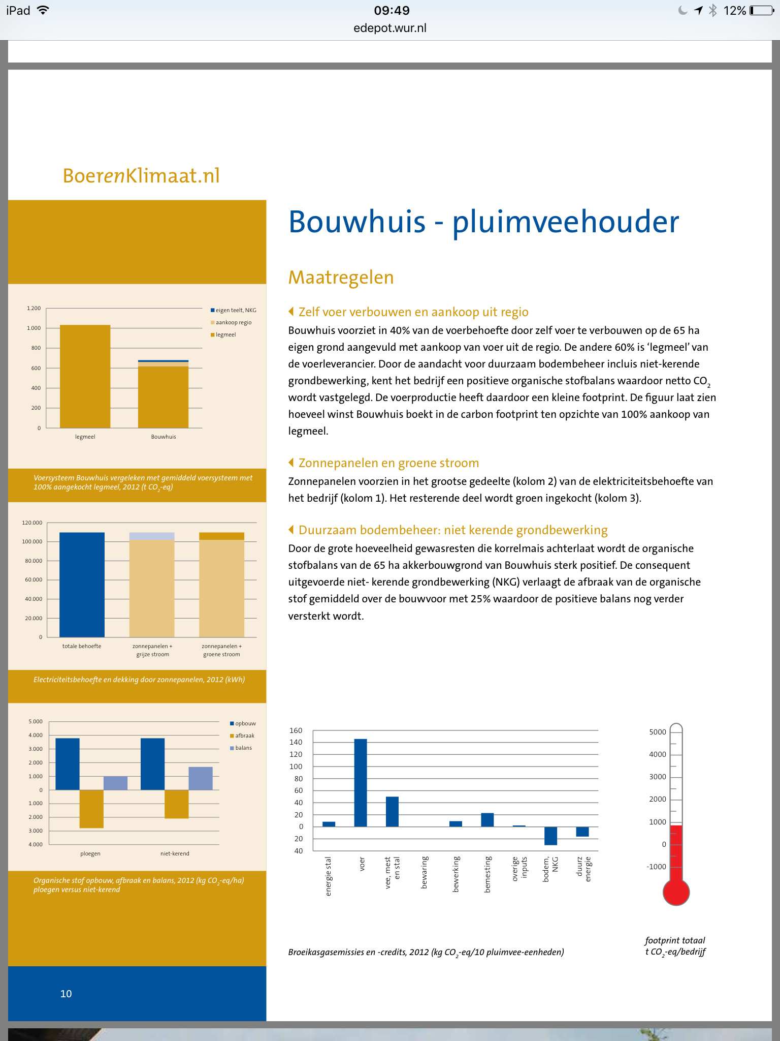 “Vanuit de kringloopgedachte wil ik mijn eigen voer verbouwen voor de kippen. Als ik meer voer nodig heb koop ik dat bij akkerbouwers uit de regio, zo blijven de lijnen kort. Maar als ik puur vanuit de portemonnee redeneer, zou ik misschien beter hoog-salderende gewassen kunnen planten, zoals aardappelen of zo. Ook de lage carbon footprint die ik op deze wijze realiseer wordt op geen enkele wijze erkend of gehonoreerd. Wel houden de zonnepanelen de energierekening laag. Doordat het bedrijf vrijwel volledig gemechaniseerd is, levert dat een besparing op qua arbeid”.