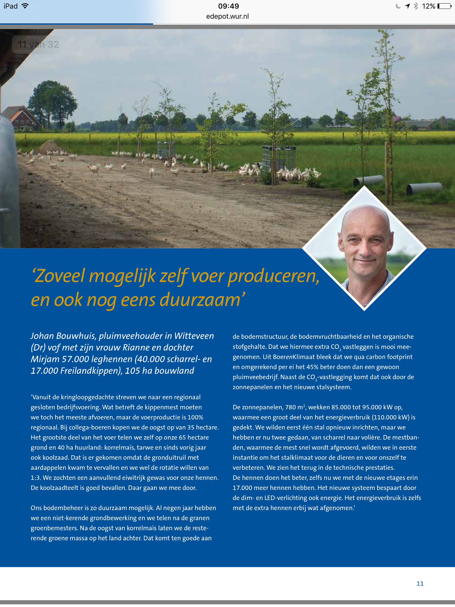 Johan Bouwhuis runt met zijn vrouw Rianne, dochter Mirjam en zoon Erik een pluimveebedrijf in het Drentse Witteveen. In 2012 was Johan al bezig met klimaat en hij was één van de deelnemers aan het netwerk Boerenklimaat.nl. Een kringloopbenadering met vruchtbare bodem als basis staat voor hem centraal. Op ruim 160 hectare verbouwt hij tarwe, koolzaad en mais. Na het gewas worden groenbemesters gezaaid. De gewasresten blijven zoveel mogelijk op het land. Ook de mest gaat zoveel mogelijk terug naar het land. Met circa 780 m2 zonnepanelen wordt voor een groot deel in het eigen elektriciteitsgebruik voorzien. De leghennen zijn voor een groot deel Freilandhennen, die kunnen scharrelen in het weiland rond de schuur, maar ook in de schuur zelf. De mest wordt in de stal belucht en zo snel mogelijk uit de stal gehaald met mestbanden.